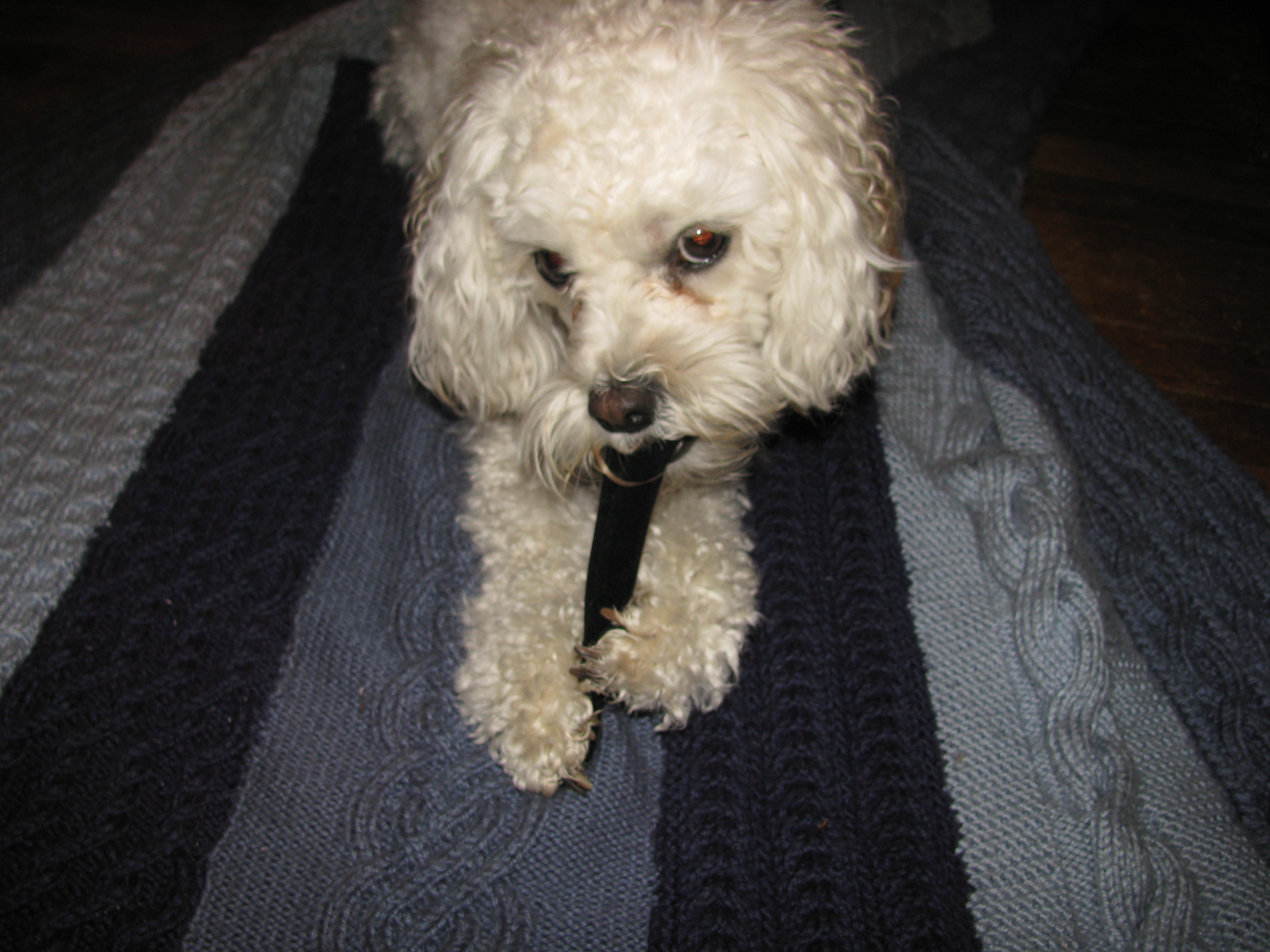 Cricket holds a stick like a flute, as if she’s about to make music and blow into the mouth piece and play notes with her paws. She can be very delicate with it. She sits eagerly in the front corner of the yard, when she’s supposed to be focused on peeing, and she chews at her stick.