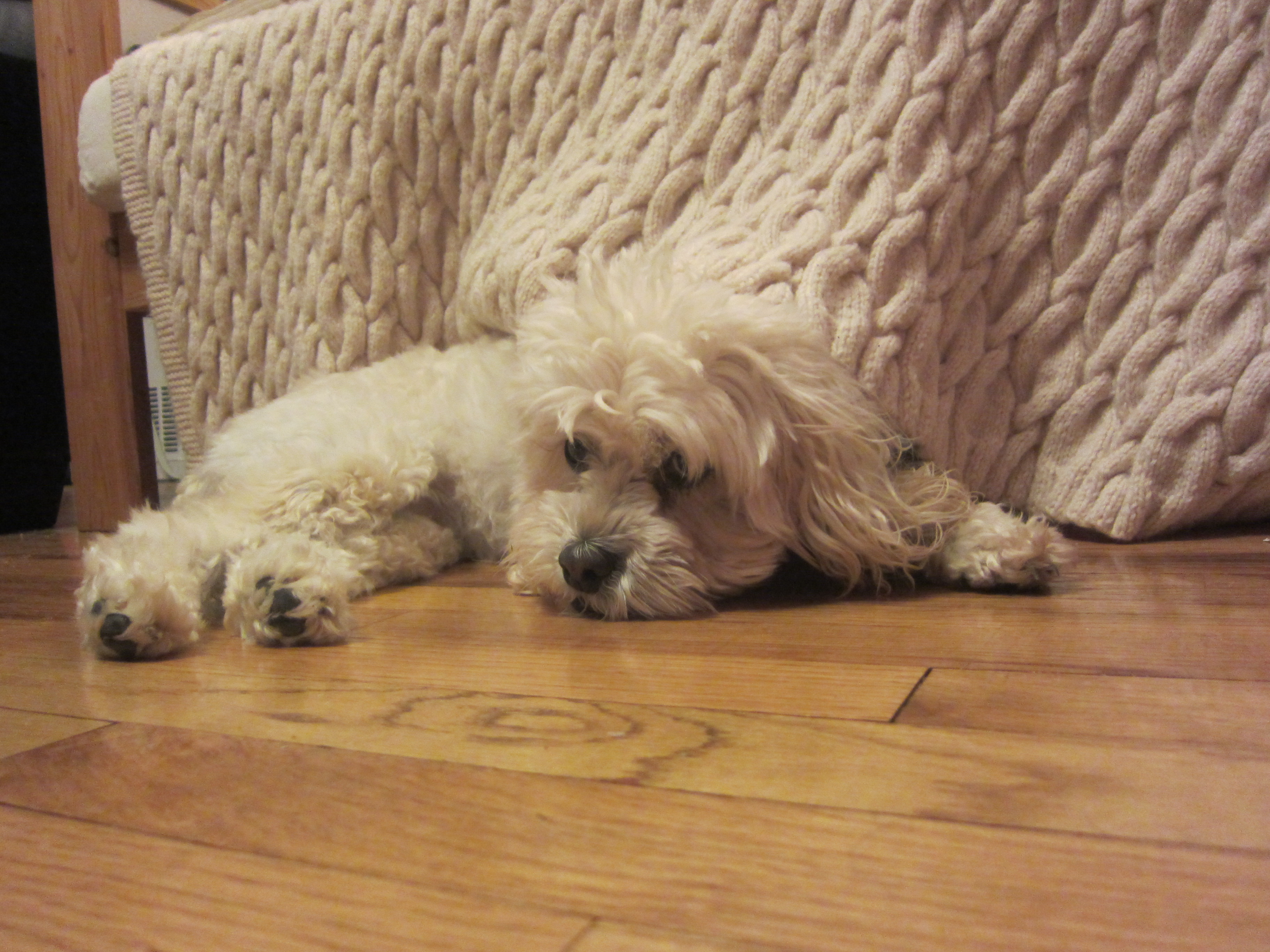 First she threw up during her mid-day walk, which isn’t that unusual for her, but then, out on a walk she did this funny thing where she walked backwards three steps and sat down, demurely, on top of her back feet. As soon as we returned to the apartment she ran under the couch, to her apartment, and stayed there. Even when chicken treats were offered, she didn’t leave her apartment. I had to bring her room service. Normal, for Cricket, is staring at the treat bag until it opens, then jumping up and trying to climb my leg to get to the treats. This sad looking dog under the couch was someone I didn’t know.