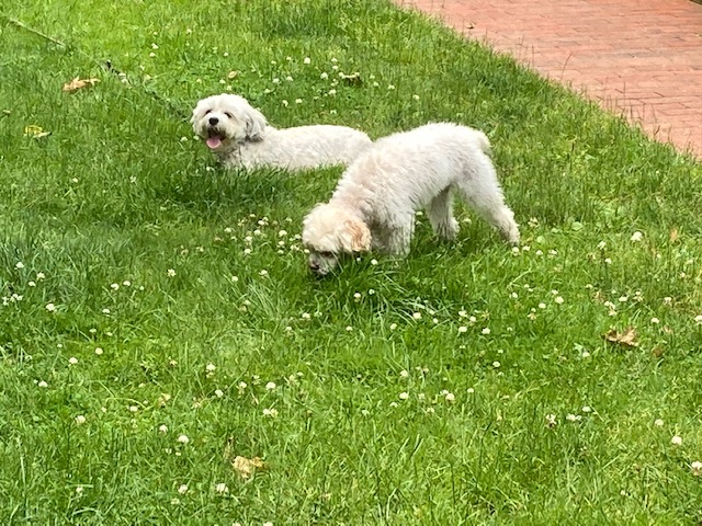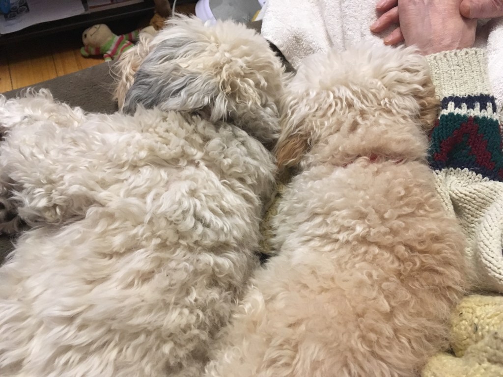When I got home, I wrapped my face in ice again (they gave me a cool little headband that wraps around my head, with pockets for the ice packs, which was much more comfortable than holding ice packs on my face with both hands), and I watched the recording of my online Hebrew class a day late, so jealous of everyone on the screen. Mom came home with updates on her hospital stay and then it was nap time, for everyone, puppies especially.