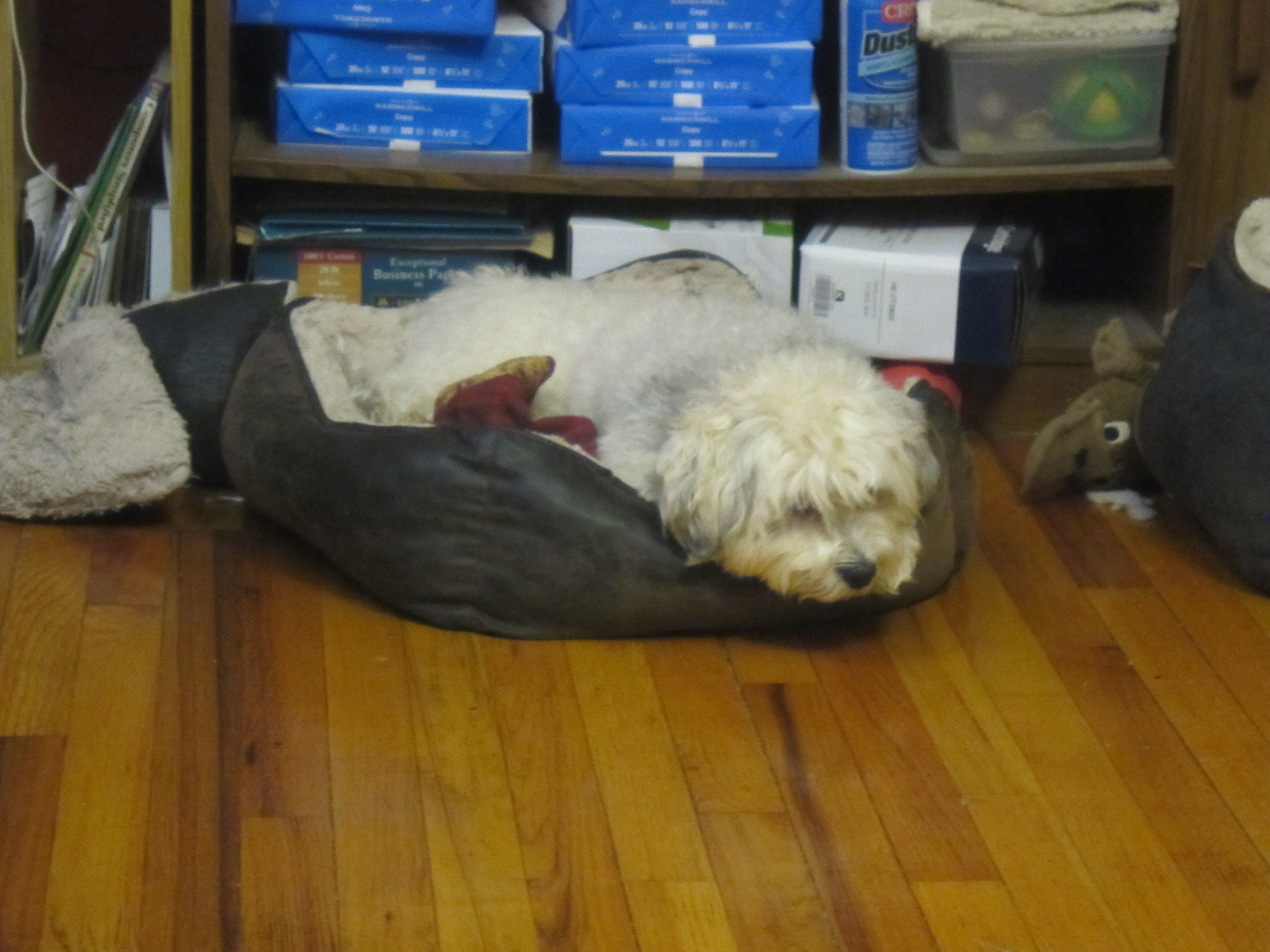 Ellie was thrilled to see us and zoomed around the yard in circles and figure eights, with breaks to come back and give us hugs and kisses, and Cricket spent her time sniffing scientifically at small patches of grass, searching for messages from her friend Kevin, the mini Golden Doodle, and looking longingly at the steps in front of his building, to no avail.