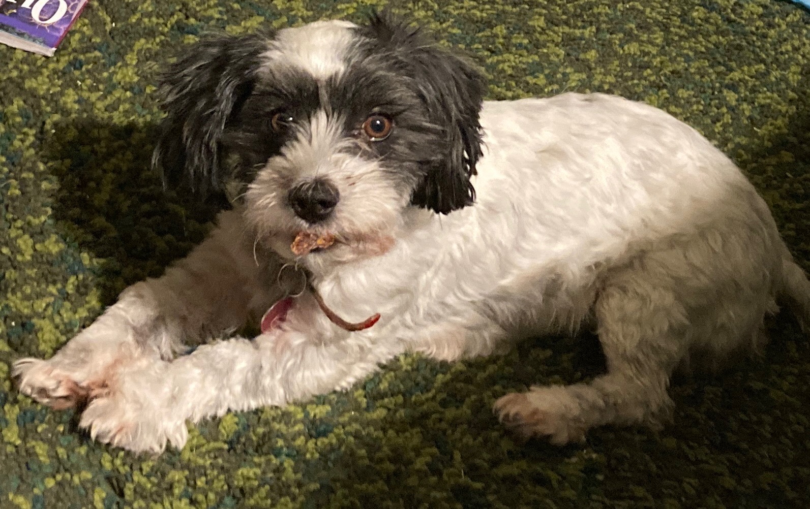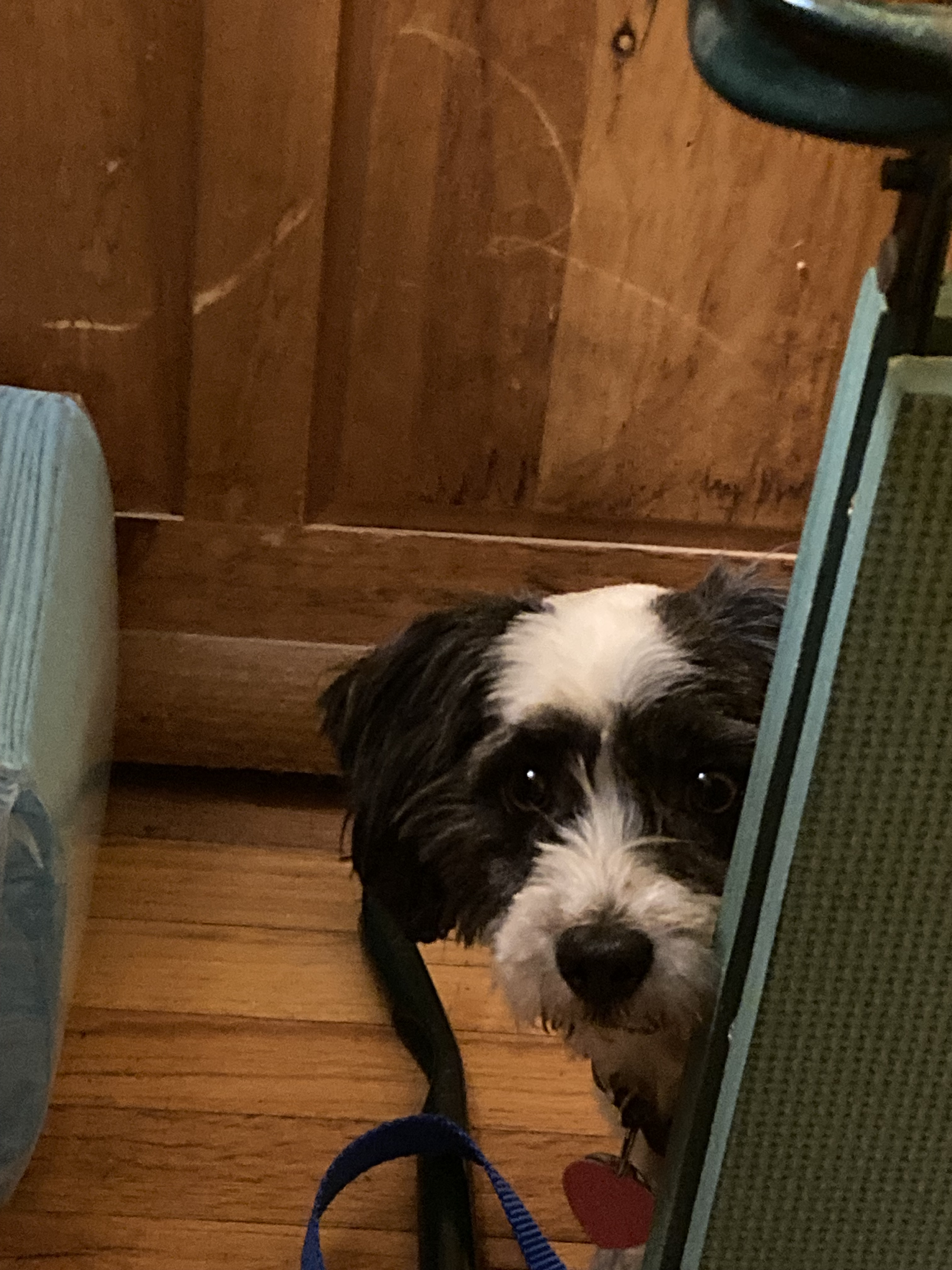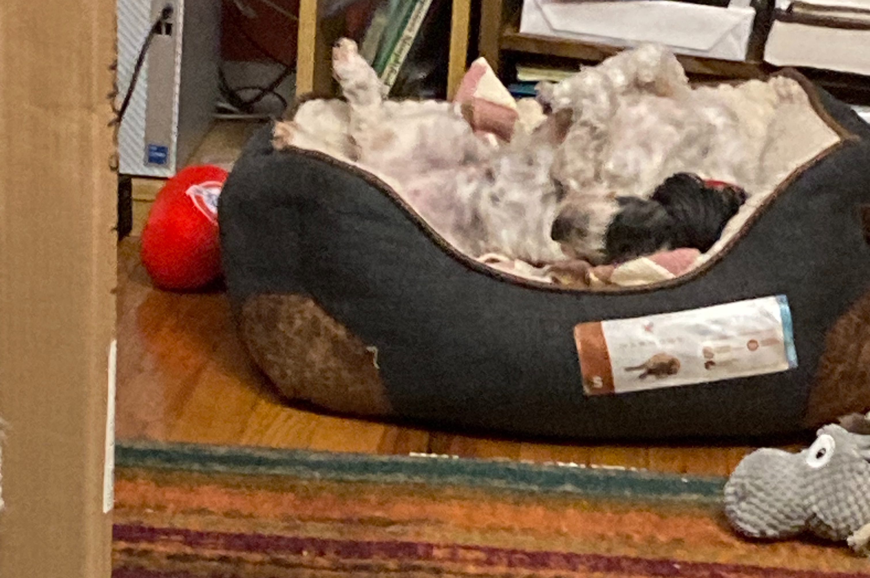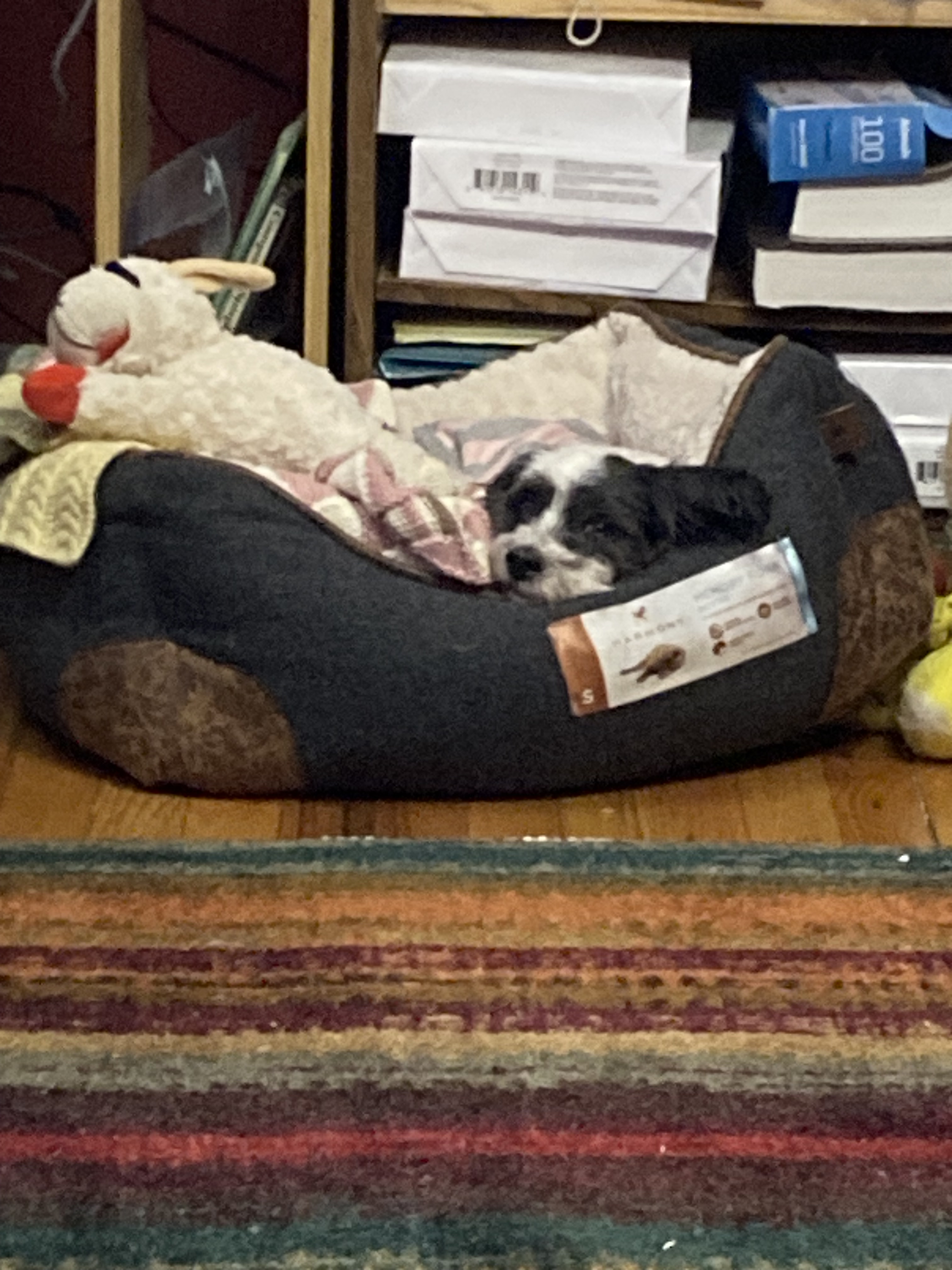 “Someone” is a four-year-old Havanese, former breeding mama, just like Ellie, though with her black and white coloring, she doesn’t remind me of Ellie too much, thank God. She hasn’t barked at all yet, and for the first few days the only thing I could see in her eyes was fear. But as time has passed, I’ve seen more and more curiosity. She’s eating well, and pooping in all the wrong places, but they are healthy poops. She spends most of her time sleeping, as if she is beyond exhausted and needs to fill up a tank that has never really been filled before.