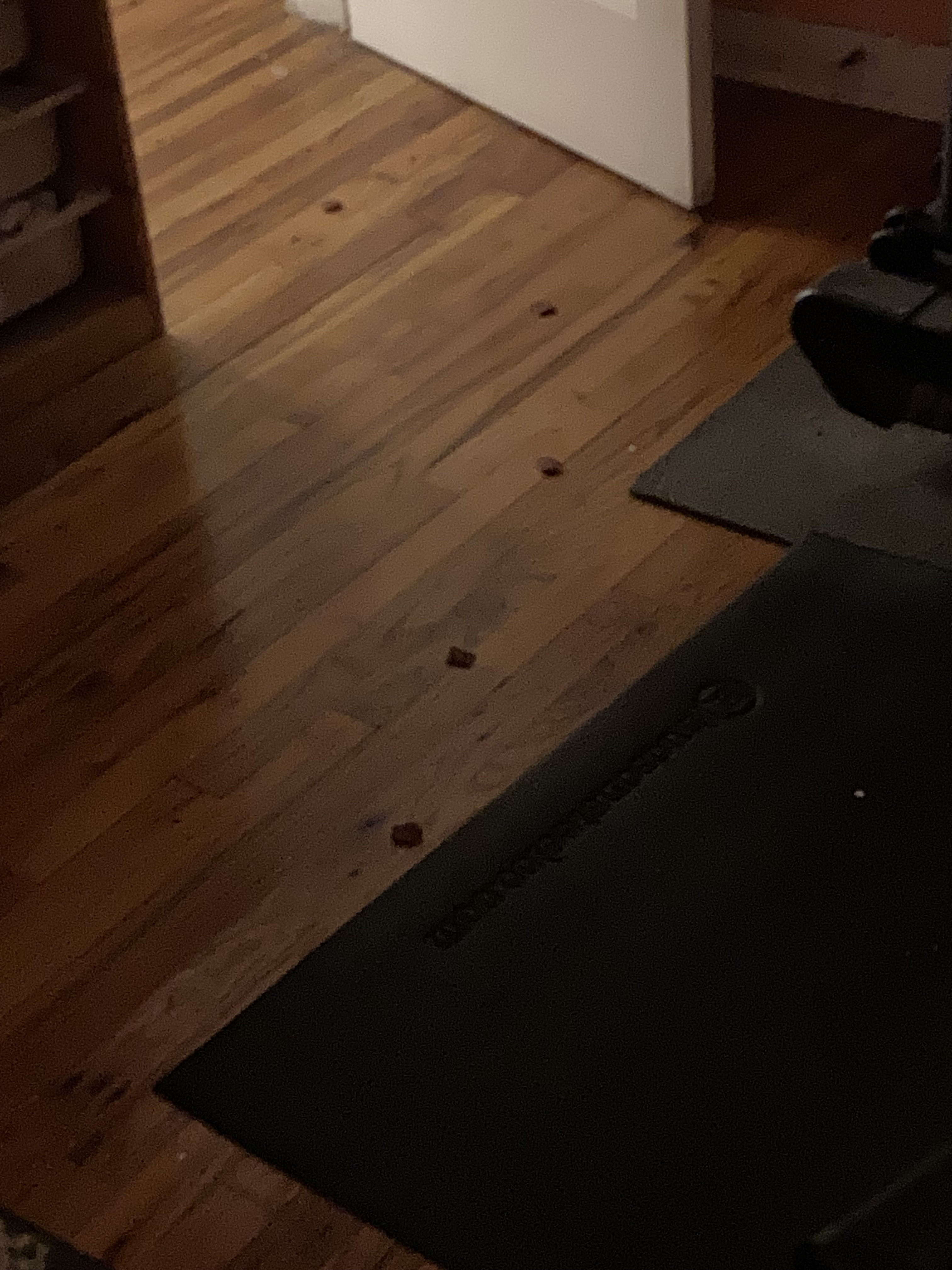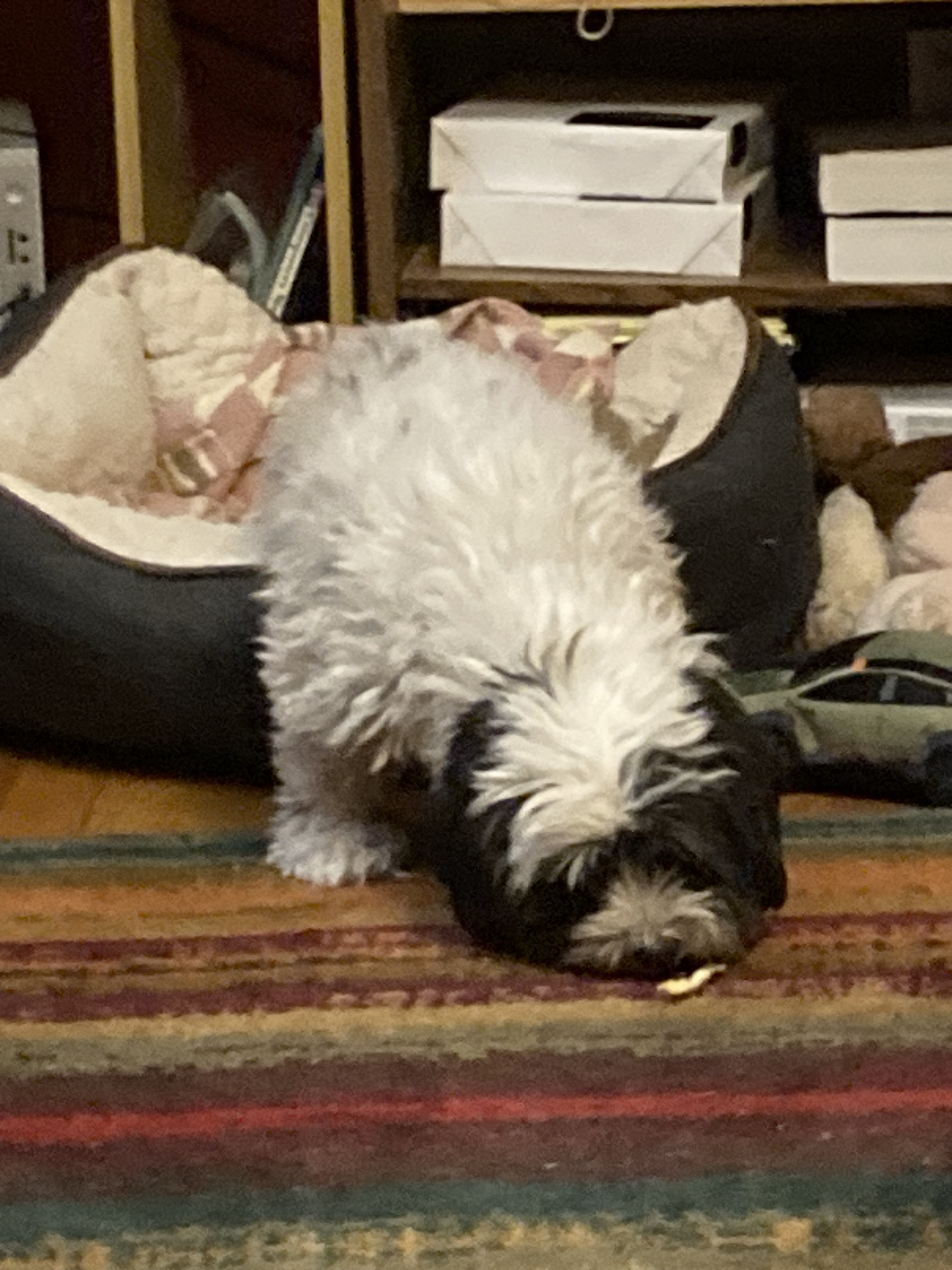 But at least now, she has learned to stop and check my doorway as she passes by, and even to linger and check more carefully in case she missed something, rather than just taking a cursory sniff and moving on. She does this at least once at night and once during the day (if I’m in my room instead of sitting in the living room with her). Not only do the chicken treats draw her attention, but they also seem to help mute her anxiety at entering my room while I am present. In the past (last week), Tzipporah would come to my door, see me seeing her, and immediately bolt; but with her nose to the ground searching for treats, she’s less concerned, or at least less aware, of where I am and what I’m doing (I am, of course, watching her and trying to get pictures).