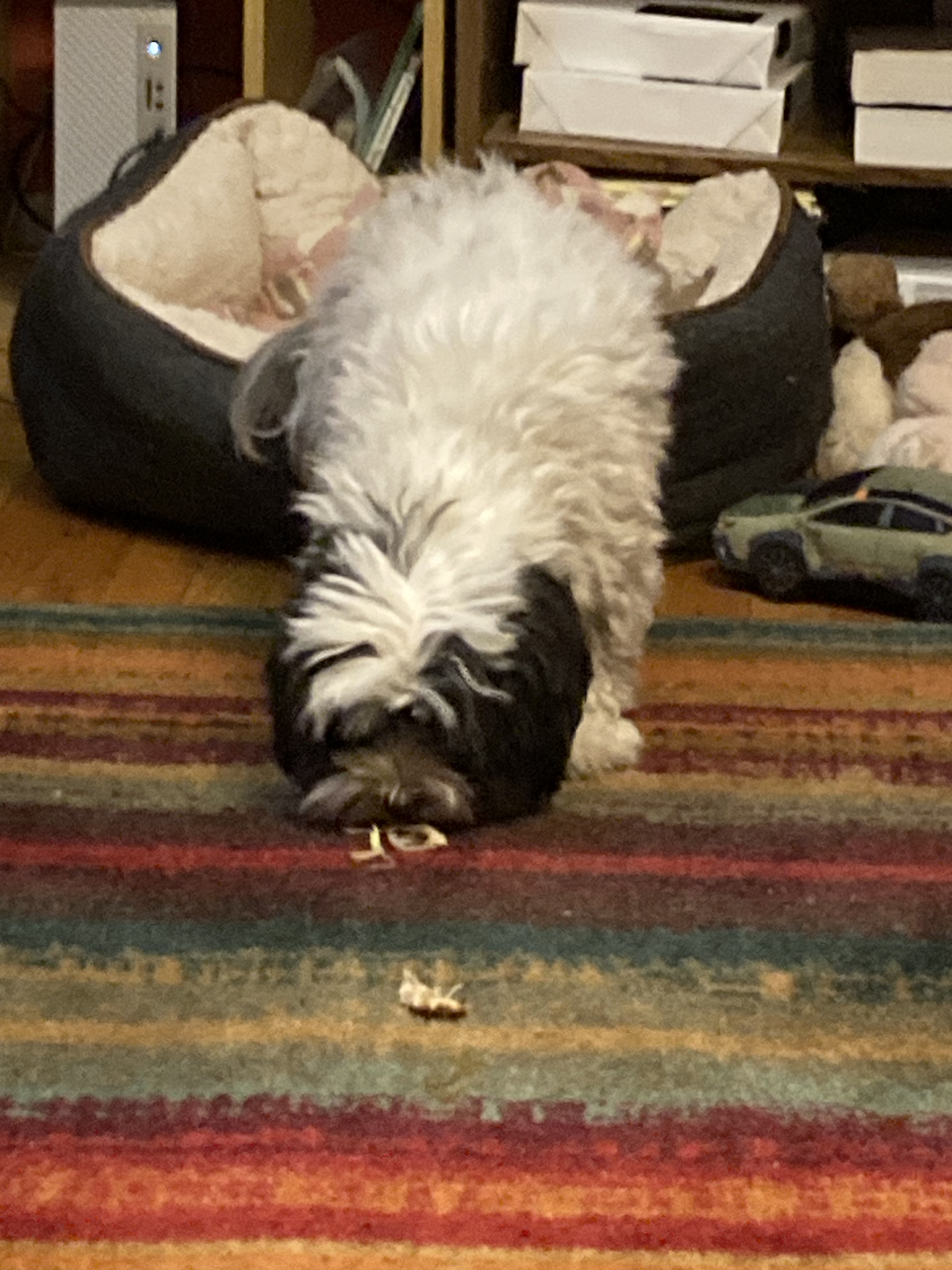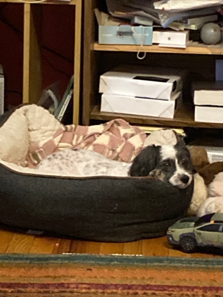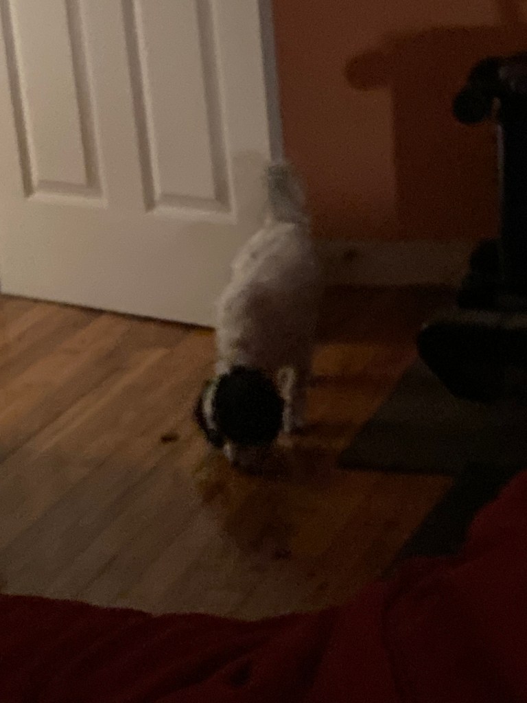 Each night, I break one piece of chicken jerky into smaller and smaller pieces, and spread them further apart so she has to actually walk into my room to find them all. And since she believes in only taking one treat at a time, no matter how small they may be, she now comes in at least five times to get through the whole trail, usually more than five, because she’s ever hopeful that more will appear. She’s still not looking up and acknowledging my presence, but we both know I’m there.