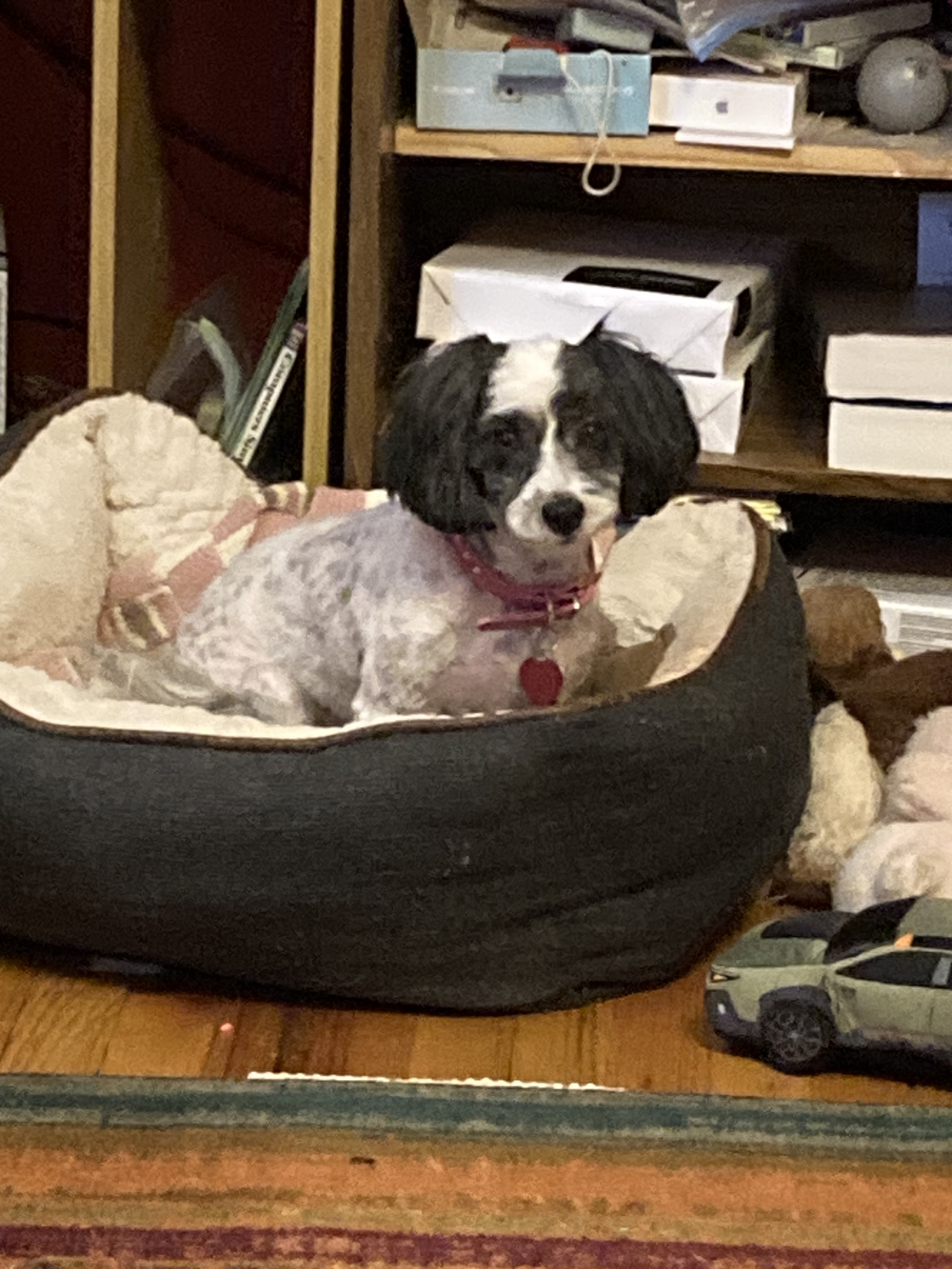 But I keep getting impatient. She still has no idea why I sometimes pick her up just to hold her for a little while (we watched an episode of a crime drama set among puppy mills in France and it almost broke me, and I needed a hug). But I can hold her for just a little while before she starts looking for any possible escape route. And then, when she finally gets free, she starts running back to her bed, stops and turns around to give me a dirty look, and then continues on her way.