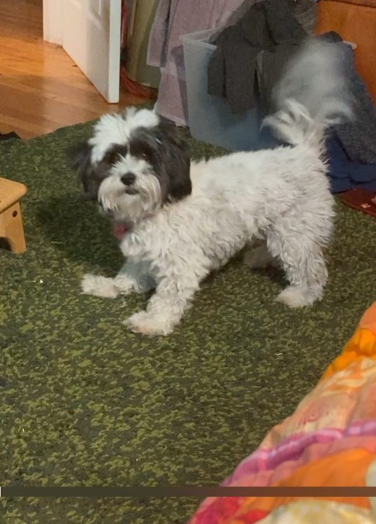 The thing is, Tzipporah really does keep making progress, even if the pace feels slow to me. During her first visit to the groomer, back in the winter, she panicked when they tried to trim the hair on her front paws, so we were told to give her some ACE (doggy Xanax) before her next visit. So this time, before we brought her for her second visit to the groomer last week, Mom broke an ACE in half and stuffed it into a piece of chicken, which Tzipporah ate with gusto. When we went to pick Tzipporah up later in the day, the groomer said everything went well, even though Tzipporah needed a “summer cut” to deal with the knots (I haven’t wanted to bother her with too much combing), which meant she was mostly shaved down to the nubs. And then, instead of handing her directly to us, the groomer put Tzippy on the floor. I was about to say, no, don’t do it, she’ll never come to me and we’ll have to chase her around the room, but Tzippy walked straight over to me without hesitation. I almost cried, because she never does that in real life! She doesn’t respond to her name, or to any other command, but there, given the choice to roam free or find one of her people, she chose a people. Which means she knows who I am, and at least prefers me to the person wielding the scissors. She even showed signs of trying to climb into the front seat of the car on the way home (her doggy seatbelt stopped her from getting too far).