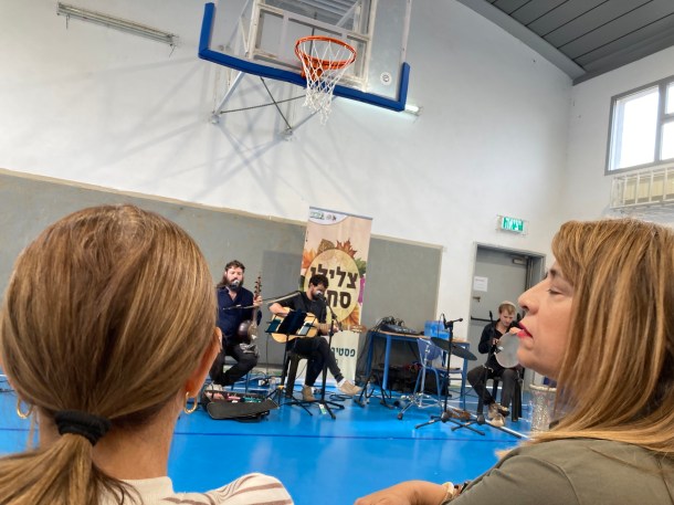After bringing the groceries home, our next event on the schedule was a small outdoor concert, part of a free music festival taking place that weekend in Modiin. The concert was billed as “Kabbalat Shabbat,” which is part of the traditional Friday night services, and it has become popular in Israel to bring religious and secular Jews together early on Friday afternoons, to sing together and welcome in Shabbat, before Shabbat officially begins. Doing it early in the day means that you can play instruments, which aren’t allowed in orthodox synagogues on Shabbat. Because of the rain, the concert was relocated to a school gymnasium, and we found seats near the front just as the show was starting. The small band was made up of four young men: a drummer, a guitarist, one guy on multiple woodwinds, and the bandleader, playing a Persian stringed instrument called a Kenchen that looked like a backwards sauté pan, with strings attached.