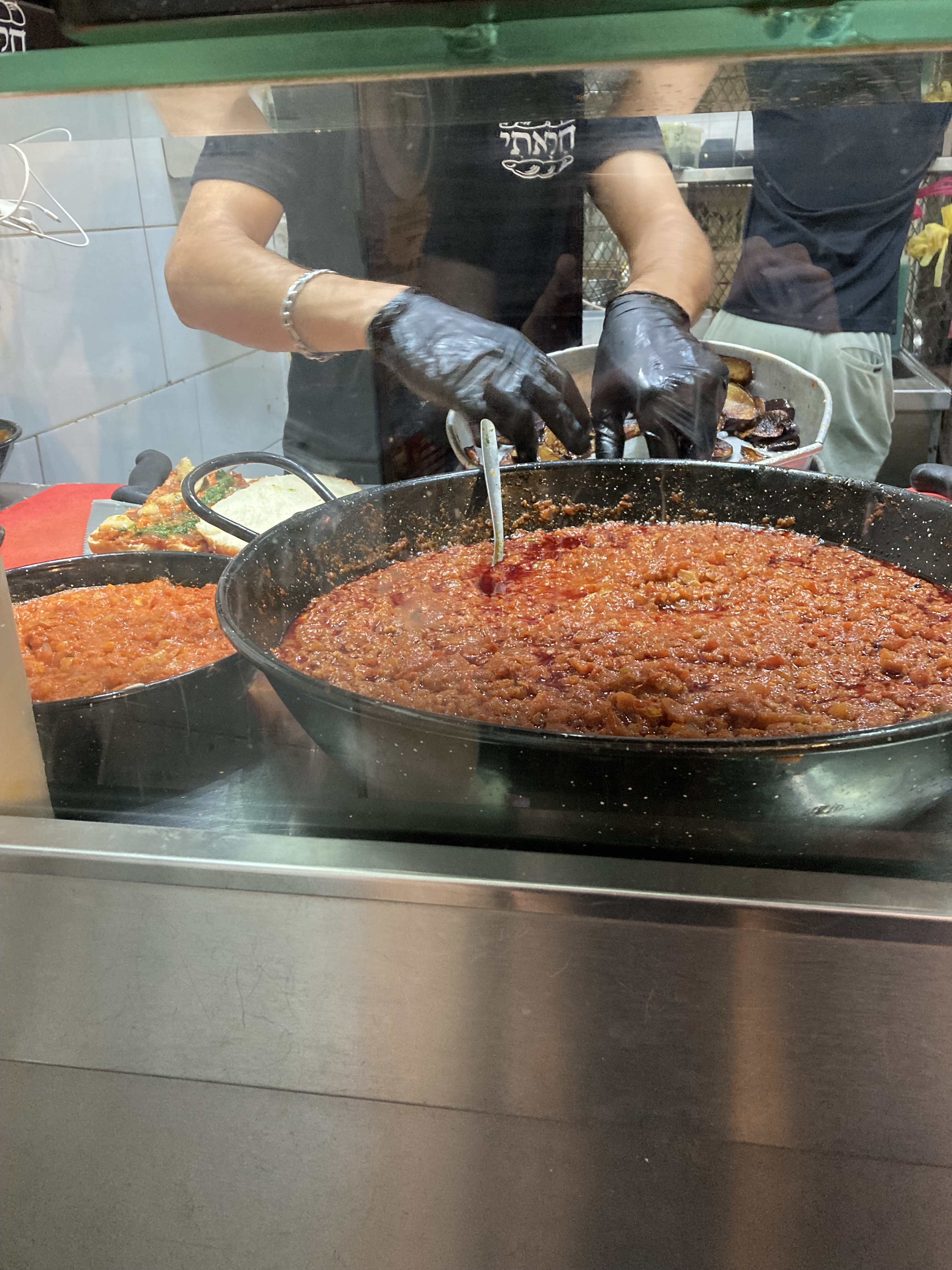 We had the Israeli equivalent of a traditional Shabbat dinner, with chicken matzo ball soup and challah and grape juice (like we do in the States) and salatim (salads and spreads), very much not like we do it in the States. My friend’s husband, who made most of the salatim, insisted that I try the olive tapenade (I’m not an olive person), and the herring (bad memories of herring in cream sauce from my childhood), but my favorites were the chummus, and the roasted onion dip, and the eggplant. My Mom is allergic to eggplant, so I was reveling in the chance to try every different version of eggplant as a main part of the meal.