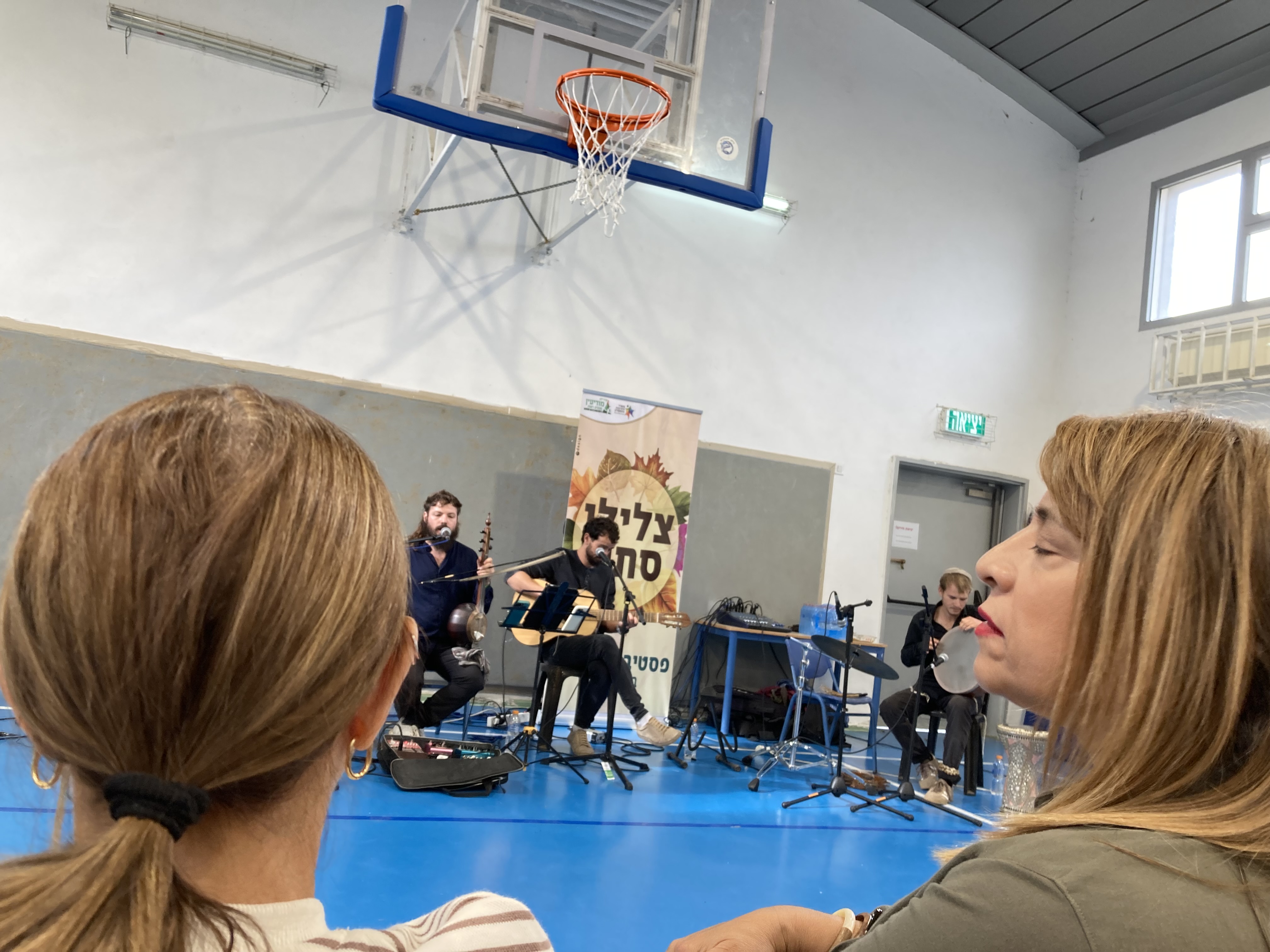 After bringing the groceries home, our next event on the schedule was a small outdoor concert, part of a free music festival taking place that weekend in Modiin. The concert was billed as “Kabbalat Shabbat,” which is part of the traditional Friday night services, and it has become popular in Israel to bring religious and secular Jews together early on Friday afternoons, to sing together and welcome in Shabbat, before Shabbat officially begins. Doing it early in the day means that you can play instruments, which aren’t allowed in orthodox synagogues on Shabbat. Because of the rain, the concert was relocated to a school gymnasium, and we found seats near the front just as the show was starting. The small band was made up of four young men: a drummer, a guitarist, one guy on multiple woodwinds, and the bandleader, playing a Persian stringed instrument called a Kenchen that looked like a backwards sauté pan, with strings attached.