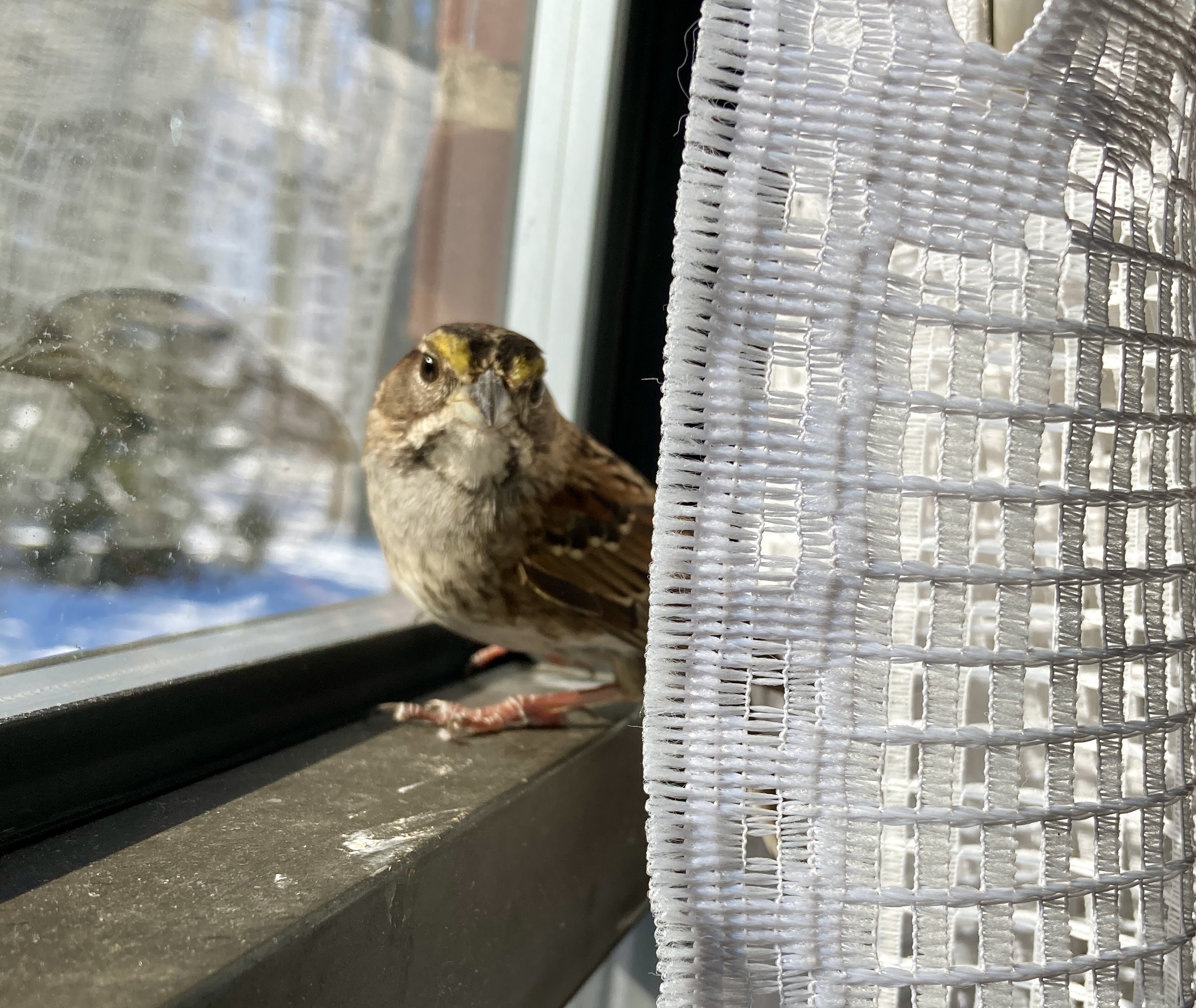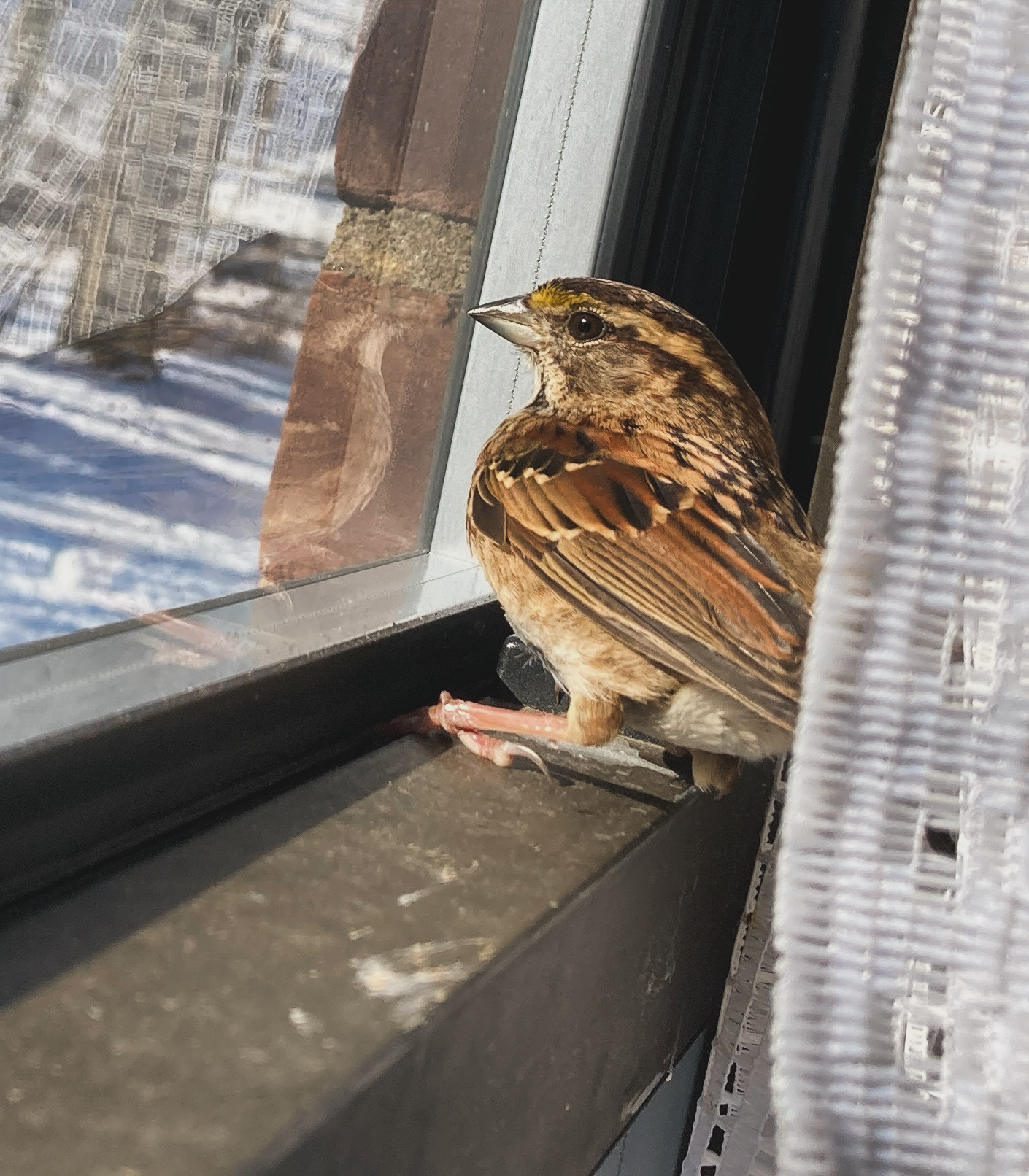 One nice thing happened before the actual vacation started which gave me hope: we had another birdie visitor. This time it was a young white-throated sparrow who either had ADD or a panic disorder and kept flying and pacing relentlessly around the apartment. Mom got some great pictures of him in the few moments when he was able to remain still.