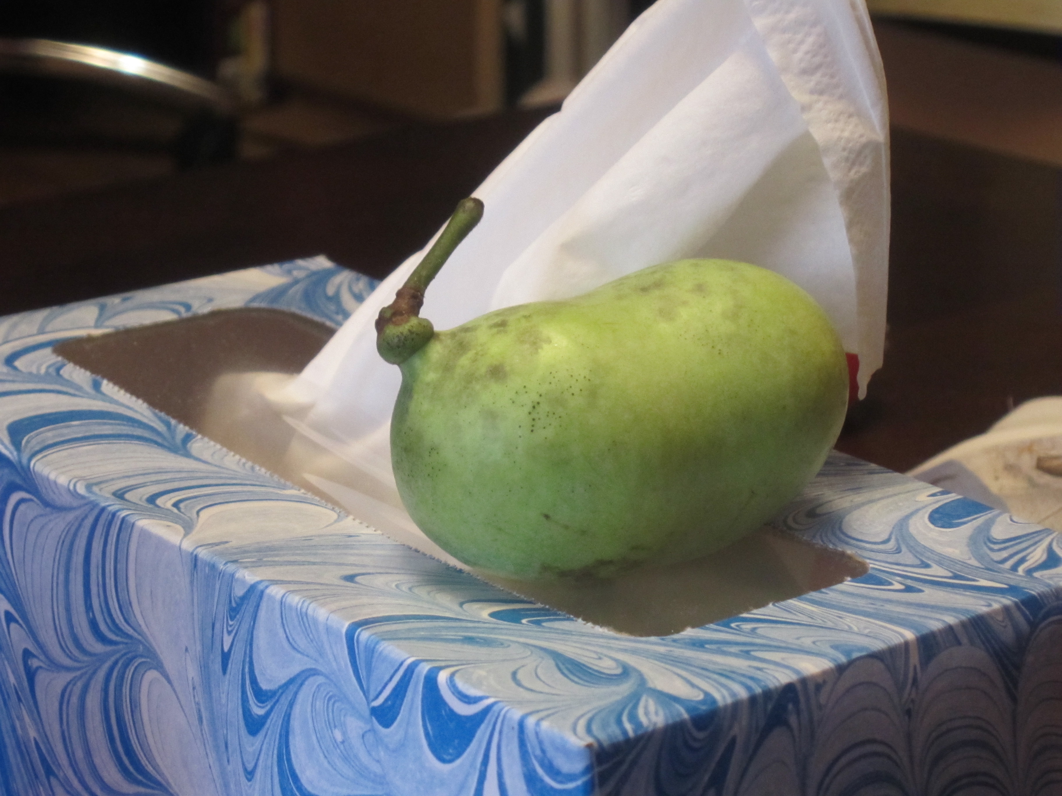 Recently there have been a bunch of articles about pawpaws in the national media, notably in the Atlantic and the New Yorker, framing paw paws as the latest gotta-have-it new thing for Brooklyn hipsters, which is weird, because I learned about them from a friend in graduate school, in North Carolina, sixteen years ago. My own pawpaw tree finally gave its first fruit last year, at age fifteen, and this year we had eight or nine pawpaws of various sizes and shapes. It’s possible that everyone else heard about pawpaws around the same time as I did, and only now do they have enough fruit to harvest and sell at random outdoor markets in Brooklyn, but who knows.