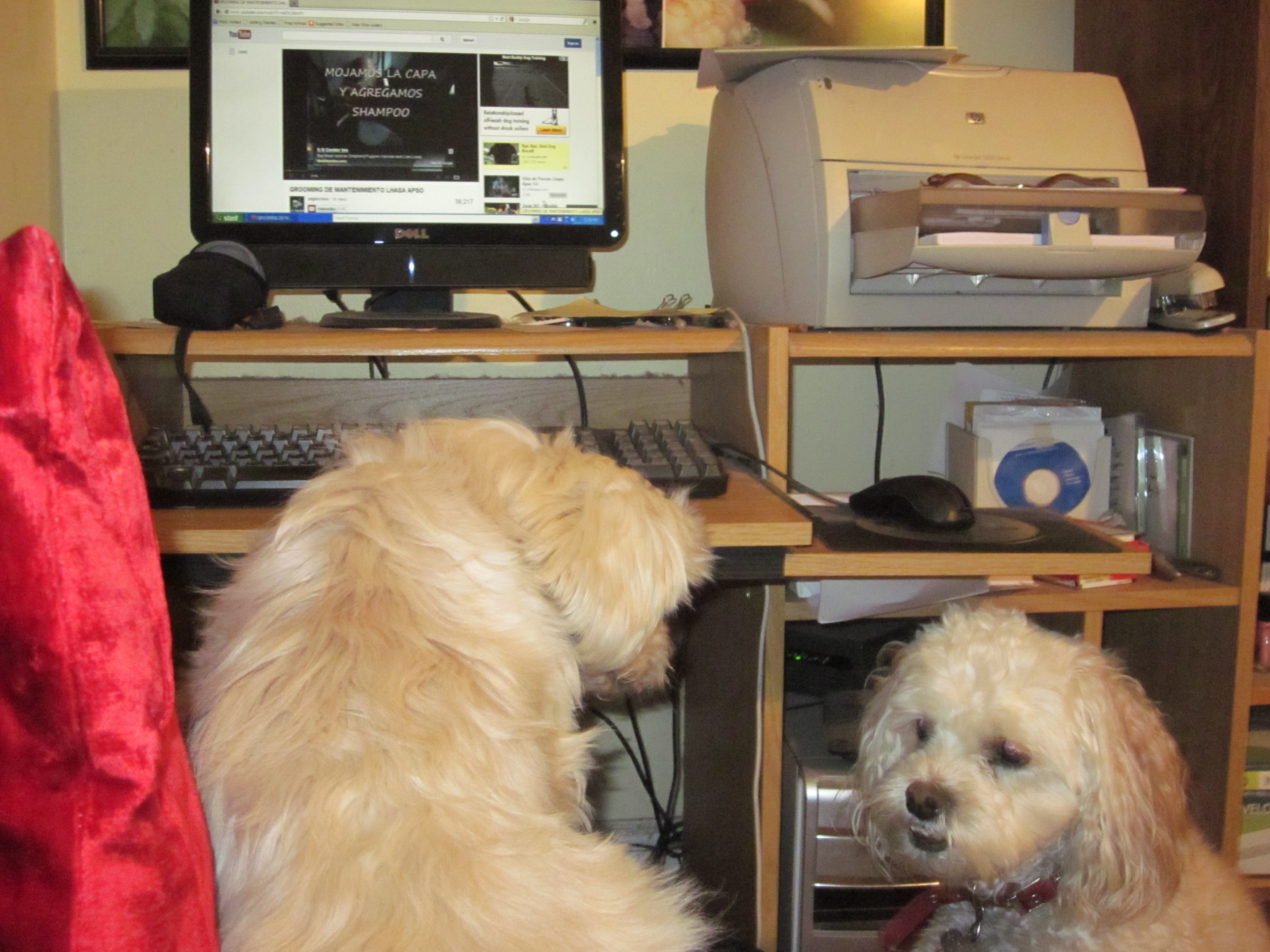But with Kevin, the five month old mini-Golden Doodle, Cricket actually went into her own version of a play bow and hopped around with him. No one watching her could believe she was fourteen years old. Ellie, meanwhile, who’d had more than enough of boy dogs when she was a breeding mama, stayed back and waited for it to be over. She allowed Kevin to sniff her a little bit, but she really really wasn’t interested.