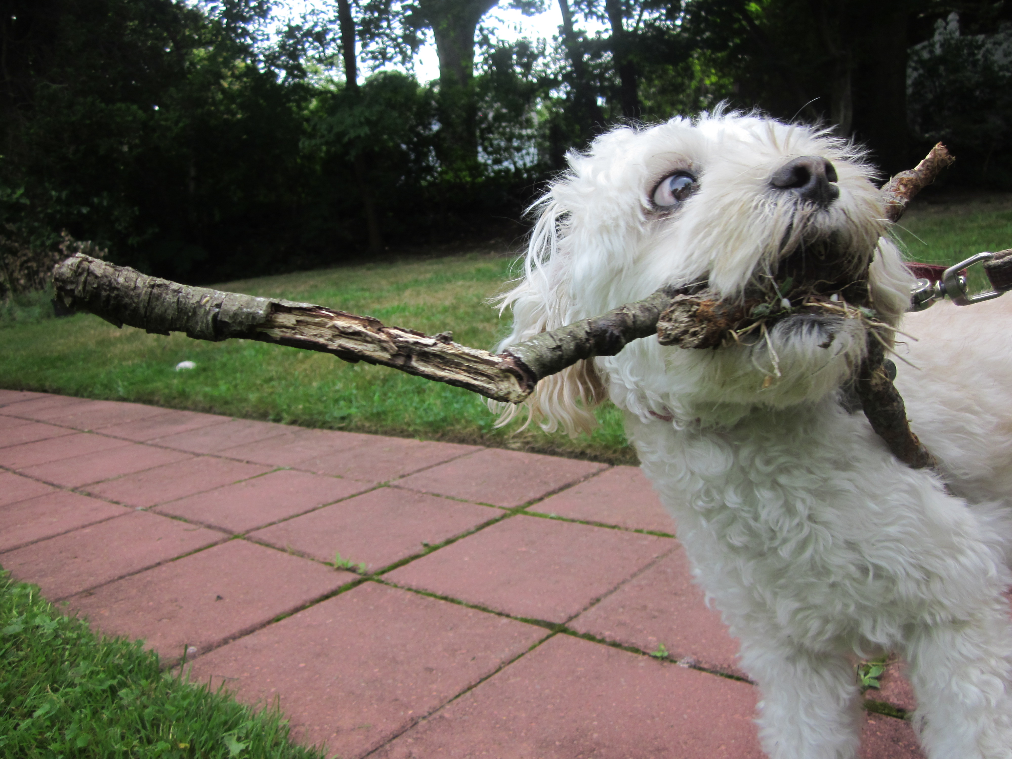 In the meantime, I did find something fun for Cricket to do closer to home that fulfills her need for excitement and lends itself to pictures for the blog. Her favorite poopy area in the backyard has been getting crowded out by weeds, and Cricket loves to battle weeds. All I have to do is pull one or two weeds up to show her the way, and she sticks her head in the ground and searches for more roots and digs and bites and steals the weeds and runs around in a frenzy. She especially likes the tall fat weeds that look like juicy green sticks.
